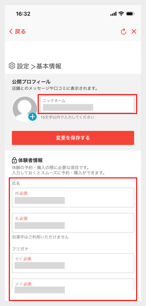 ニックネームや、体験者情報(スクロールすると氏名のほかにも項目あり)を入力し、[変更を保存する]をタップ。