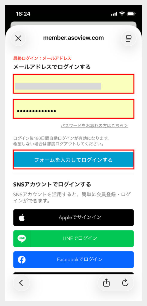 メールアドレスとパスワードを入力して、[フォームを入力してログインする]をタップ。