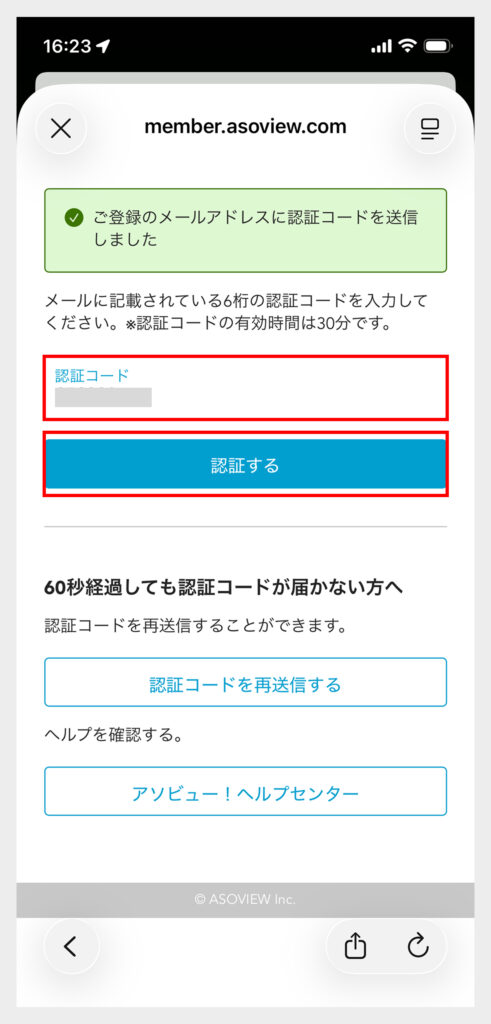 登録したメールアドレスに認証コードが送信されるので、その認証コードを入力して、[認証する]をタップ。