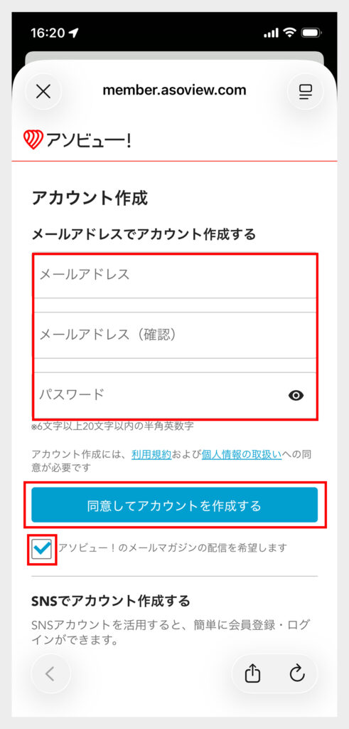 メールアドレス・メールアドレス(確認)・パスワードを入力する。