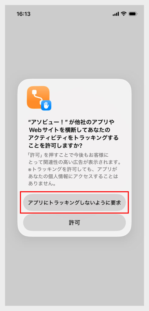 トラッキング許可の画面が出ますが、説明を読んで好みの方を選択してください。