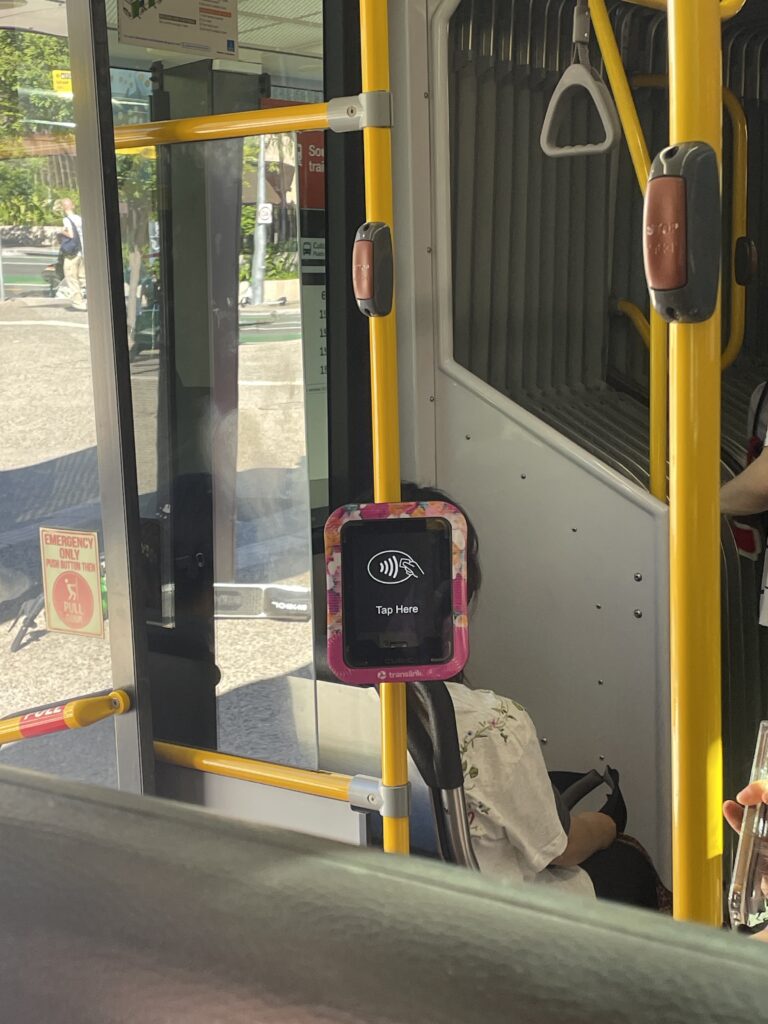 写真は2026年2月にオーストラリアのブリスベンに行った時のものですが、先述のエクスプレスカードの設定をしてあったため、Suica同様にスリープ状態のまま(アプリをたちあげることもなく)タッチで乗降車できました。