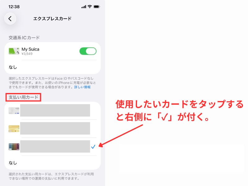 4.「支払い用カード」欄で、交通機関で使いたいクレジットカードを選択